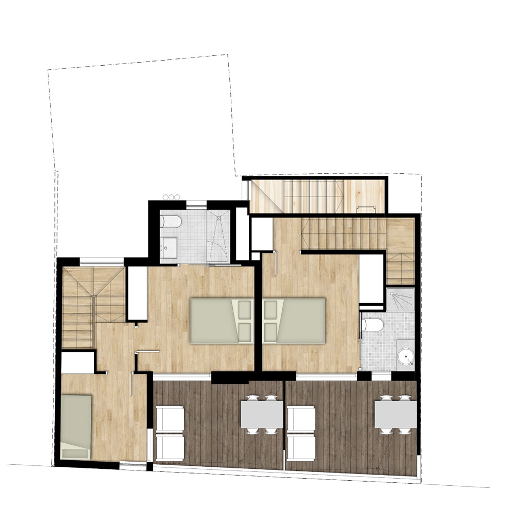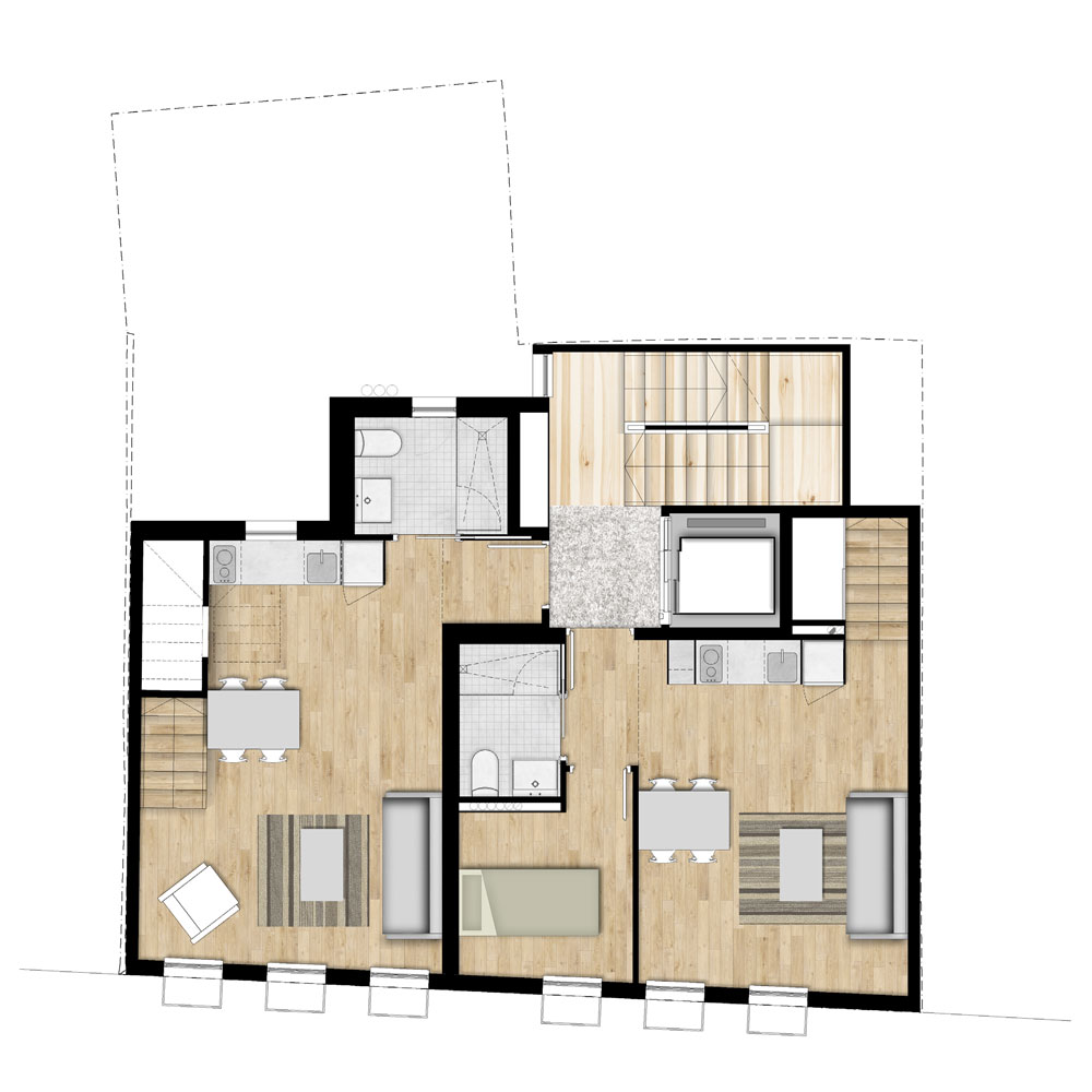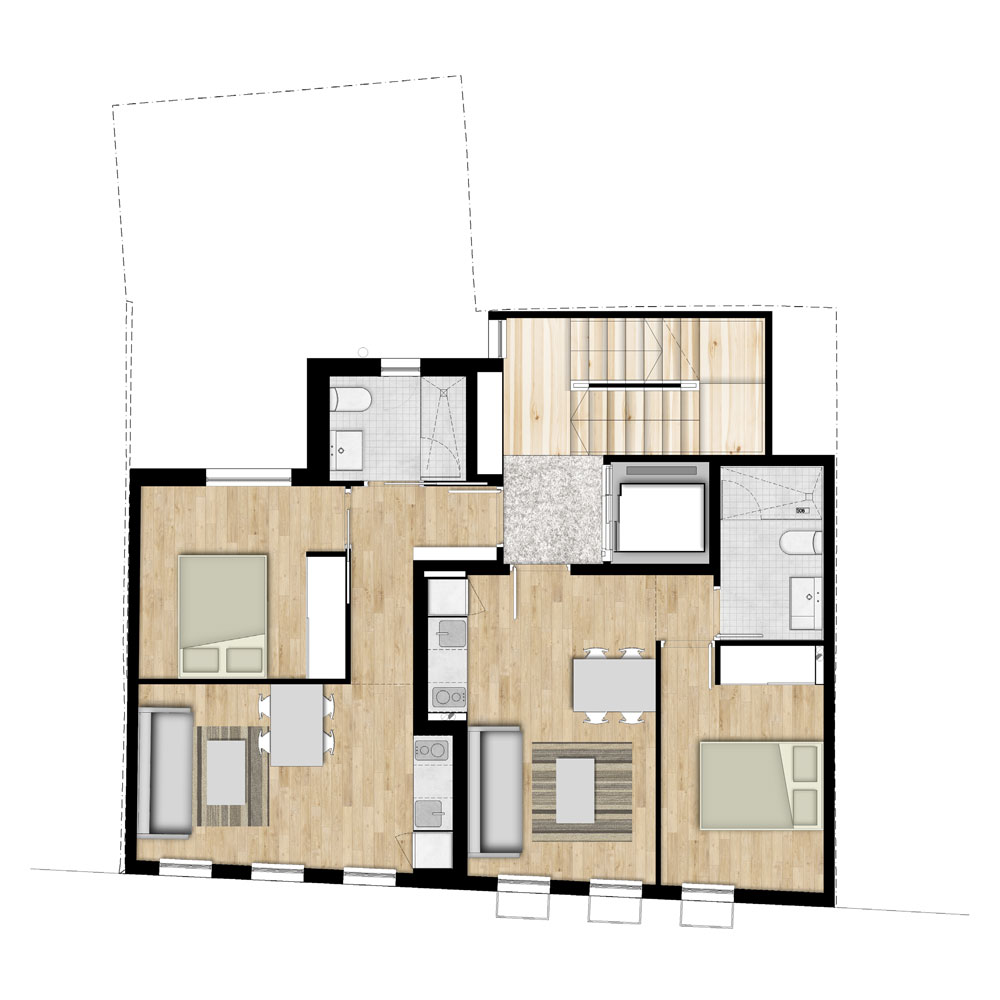 La estructura del edificio, de paneles de madera contralaminada o CLT, permite alcanzar altos parámetros de confort en las viviendas, derivado del excelente comportamiento como aislante acústico y térmico de la madera. El usuario se beneficia del bajo nivel de mantenimiento que requiere el CLT debido a su durabilidad, un sistema seguro y muy avanzado en la tecnología de la construcción, que surge de una voluntad por conseguir el mínimo impacto medioambiental.